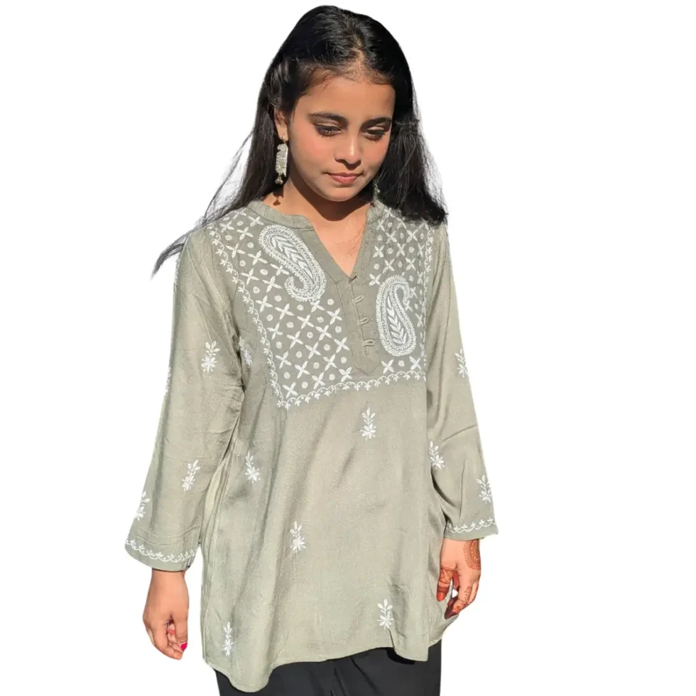 Add a refined touch to your wardrobe with this Sage Green Rayon Top, beautifully adorned with exclusive handmade Chikankari work. The Mandarin collar paired with a V-neck creates a graceful, contemporary look suitable for daily wear as well as semi-festive gatherings. Its soft, breathable rayon fabric ensures effortless comfort—perfect for summer days.